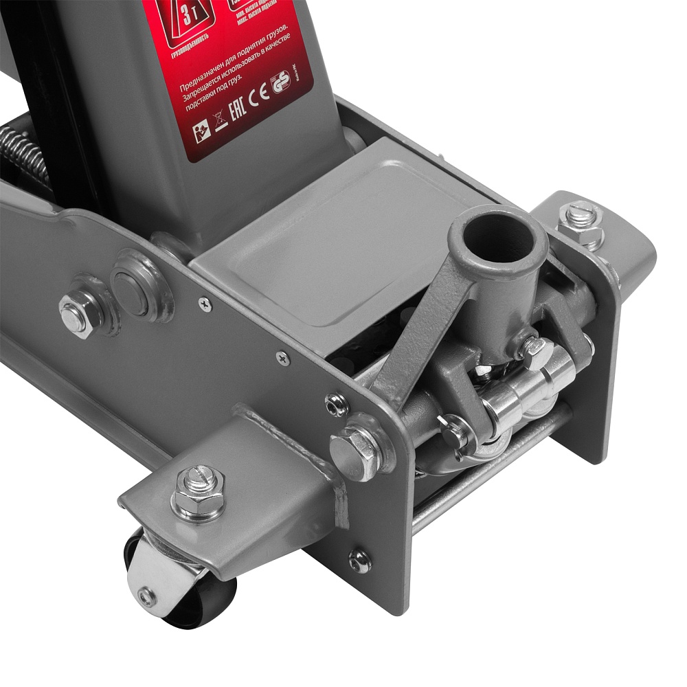 - Безопасная эксплуатация — предохранительный клапан препятствует подъему груза массой более 3 т, предотвращая поломку домкрата.
