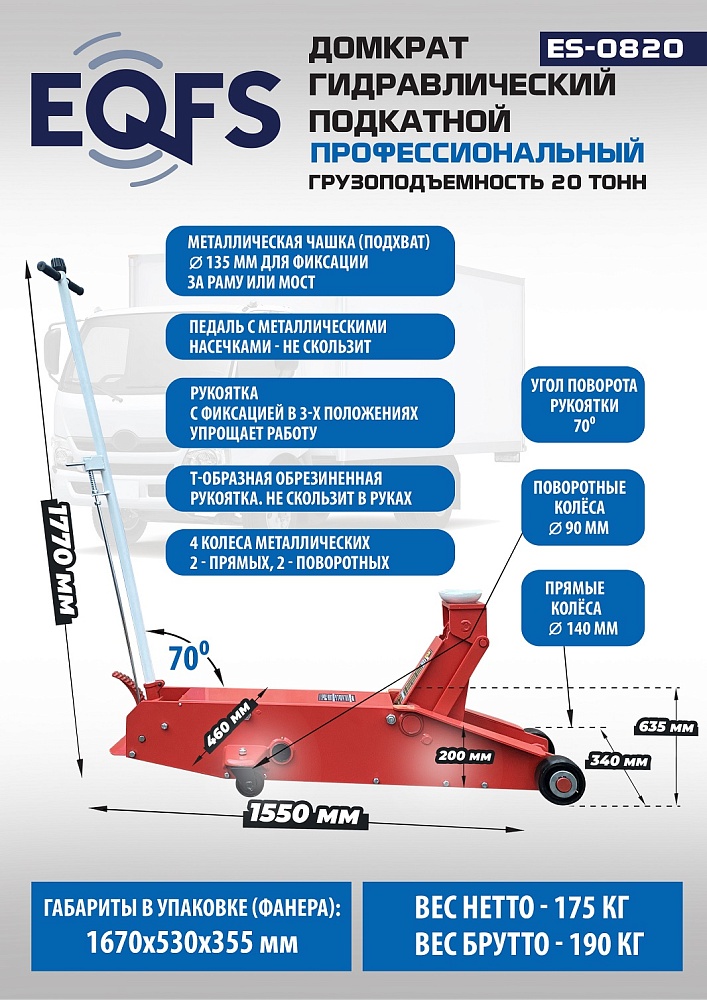 Увеличенная длина домкрата позволяет производить подхват под раму и мосты грузовых автомобилей. Ножной привод позволяет быстро подводить опорную чашку (подхват) до нужной высоты. Клапан защиты от перегрузки. Рукоятка привода составная с обрезиненной ручкой – предотвращает случайное повреждение дверей автомобиля. Домкрат рекомендуется к применению в шиномонтажных мастерских, автосервисах и авторемонтных предприятиях. Высота подъема 200-635 мм. г/п 20 т.