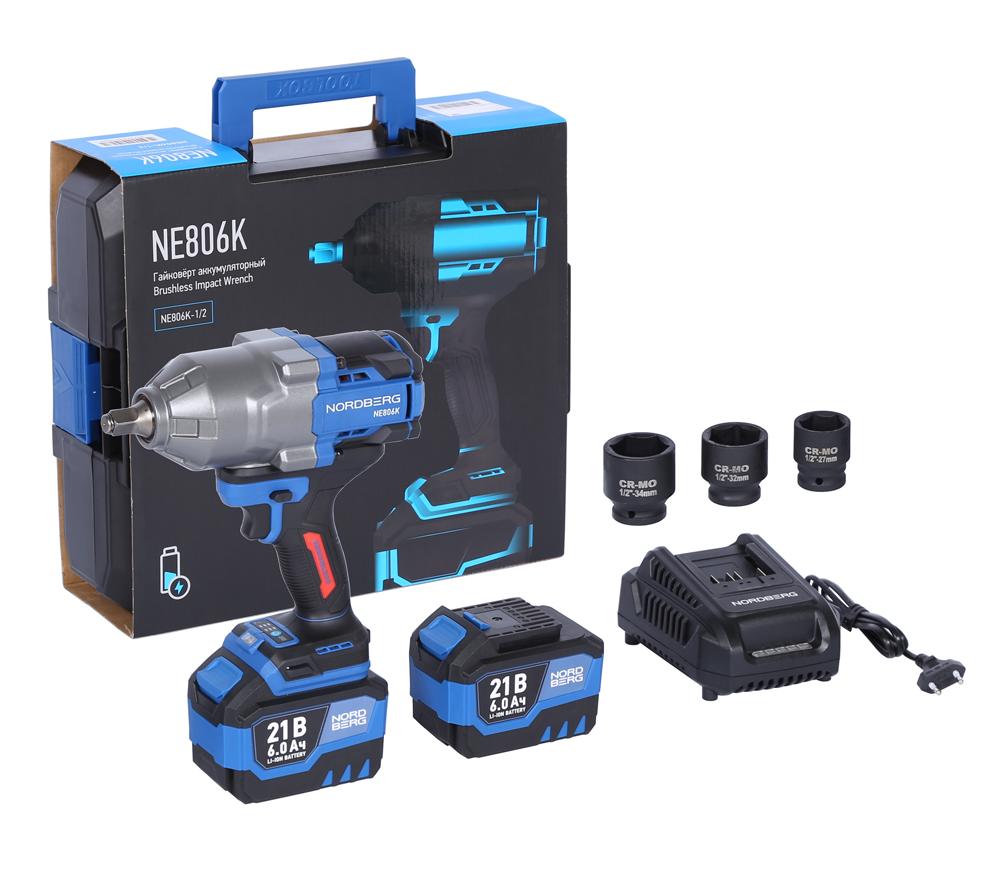 Гайковерт аккумуляторный, 1/2", 21 В, 1500 Нм, 2 аккумулятора 6 A и зарядное устройство, в кейсе NORDBERG NE806K-1/2