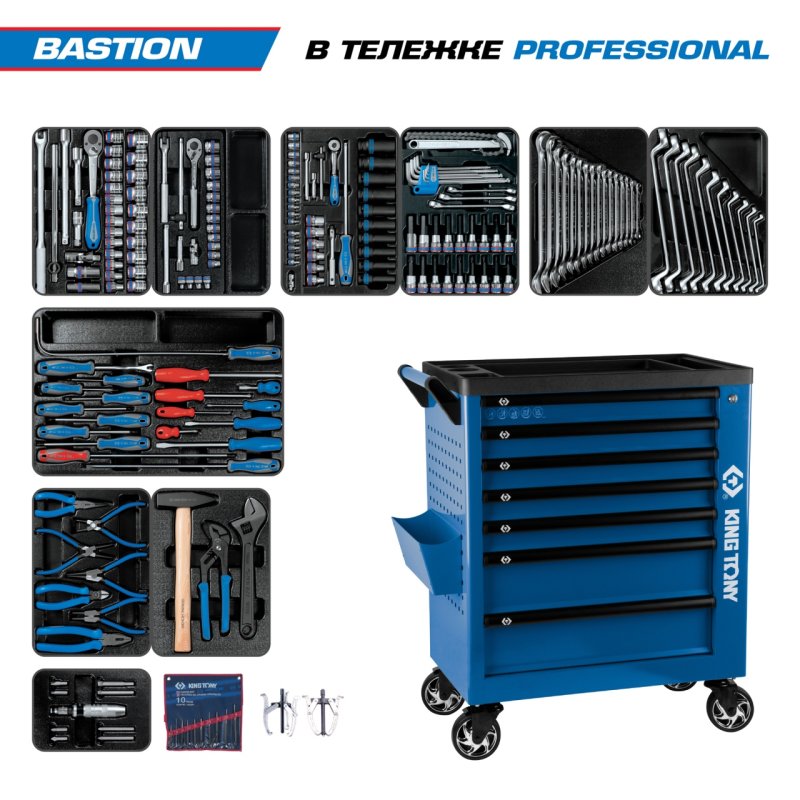 Набор инструментов 204 предмета, "BASTION", в синей тележке KING TONY 9G38-100MRB купить в Уфе цена ✅ - Все для СТО