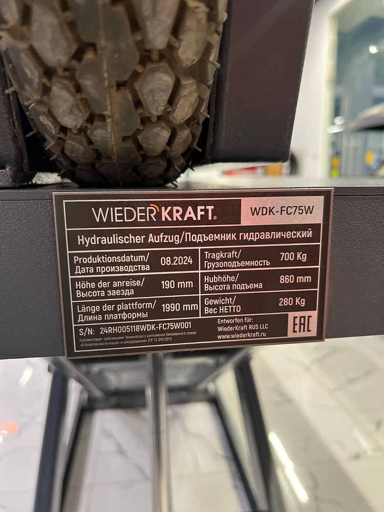 Пневмогидравлический подъёмник для мототехники WDK-FC75W имеет следующие технические характеристики: