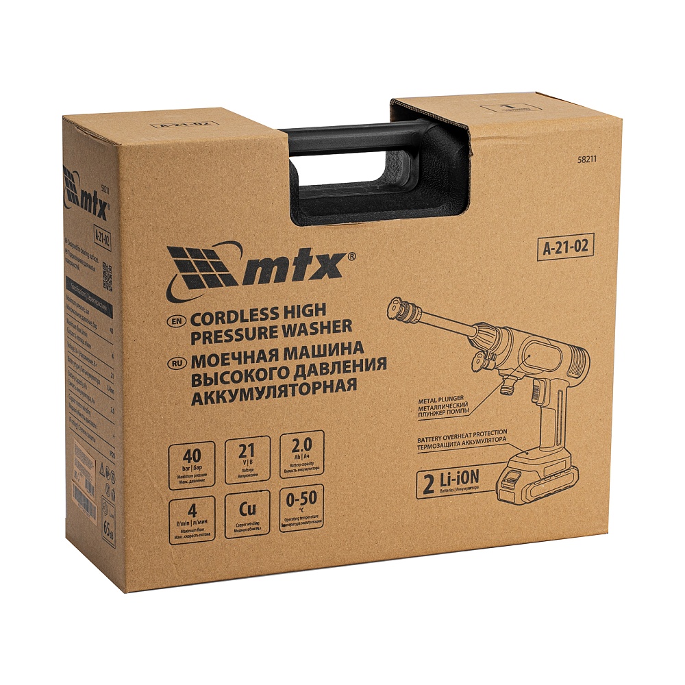 <p>Аккумуляторная моечная машина высокого давления MTX A-21-02 58211 производительностью 4 л/мин работает от аккумулятора Li-Ion 21 В (в комплекте 2 шт.). Используется для мытья фасадов зданий, автомобилей, садовых инструментов и т.д. Оптимальна для бытового применения. Аккумуляторная батарея Li-Ion без эффекта памяти, емкостью 2 А·ч, обеспечивает длительную работу. Аккумулятор такого типа допускает подзарядку без потери емкости. Машина проста в использовании и не требует специального обслуживания. Максимальное давление — 40 бар.</p><h2>Преимущества</h2><ul><li>Эффективное очищение — моечную машину можно использовать с моющими средствами, для этого предусмотрен внешний пенокомплект.</li><li>Долговечность — помпа с металлическим плунжером обладает высоким ресурсом и надежностью.</li><li>Удобное использование — быстросъемные насадки позволяют легко выбирать нужную форму факела распыла воды</li><li>Простая подготовка к работе — быстросъемный коннектор облегчает подключение шланга.</li><li>Безопасность — термозащита предотвращает повреждение двигателя в случае перегрева.</li><li>Защита от засорения — входящий в комплект сетчатый фильтр препятствует попаданию в механизм моечной машины мусора и других твердых частиц.</li><li>Бесперебойная работа — в комплект поставки входит 2 аккумулятора и зарядное устройство, что позволяет не прерываться надолго, если нужно зарядить батарею.</li><li>Удобная упаковка — моечная машина с аксессуарами поставляется в кейсе для хранения и транспортировки.</li></ul>