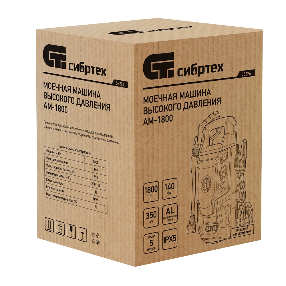 <p>Колесная моечная машина высокого давления Сибртех AM-1800 58226 мощностью 1800 Вт и производительностью 350 л/ч подает струю воды 140 бар. Позволяет быстро очистить садовые дорожки, забор, стены строений, садовый инвентарь, уличную мебель, кузов автомобиля. Машина подключается к водопроводу, а также способна работать в режиме самовсасывания — в этом случае в качестве источника воды можно использовать любую емкость. Устройство будет полезно владельцам дачных участков.</p><h2>Преимущества</h2><ul><li>Высокий ресурс — алюминиевая помпа выдерживает интенсивное использование.</li><li>Экологичность — во время работы машины отсутствуют вредные выхлопы и неприятный запах.</li><li>Термозащита — в случае перегрева двигатель отключается для предотвращения поломки.</li><li>Электробезопасность — токопроводящие элементы имеют двойную изоляцию.</li><li>Удобная регулировка струи — вращая корпус сопла, можно установить оптимальный вид распыления.</li><li>Эффективное очищение — в комплект поставки входит внешний пеногенератор, позволяющий использовать моющие средства.</li><li>Удобная работа в труднодоступных местах — на пистолет можно установить насадку-удлинитель.</li><li>Безопасность — блокировка рычага пистолета предотвращает случайный запуск.</li><li>Защита от засоров — входной штуцер имеет встроенный фильтр, задерживающий посторонние частицы.</li><li>Легкая подготовка к работе — быстросъемный адаптер позволяет подключить входной шланг одним движением.</li><li>Свободное передвижение по рабочей зоне — длина сетевого кабеля и шланга составляет 5 м, что позволяет реже перемещать мойку во время работы.</li><li>Простое обслуживание — в комплект поставки входит игла для прочистки сопла.</li><li>Продуманное хранение и транспортировка — машина снабжена удобной ручкой и колесами, для кабеля и шланга предусмотрены специальные кронштейны.</li></ul>