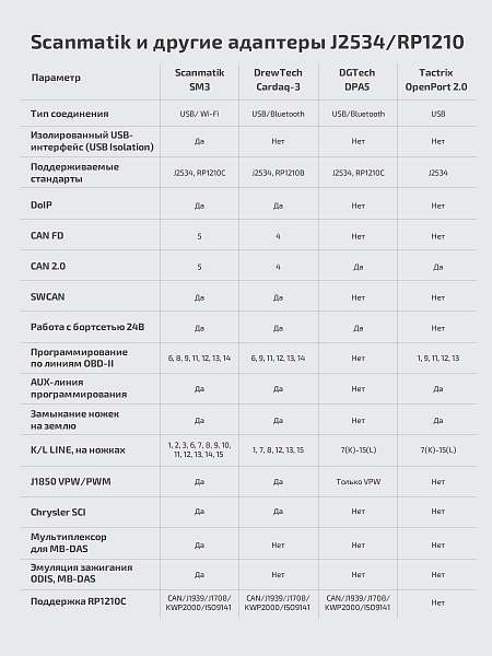 Реализация стандарта RP1210C - без каких либо ограничений. SM3 полностью заменяет приборы DPA5/Nexiq/Inline-6 с поддержкой всех протоколов и гораздо более шустрым и удобным соединением по Wi-Fi.