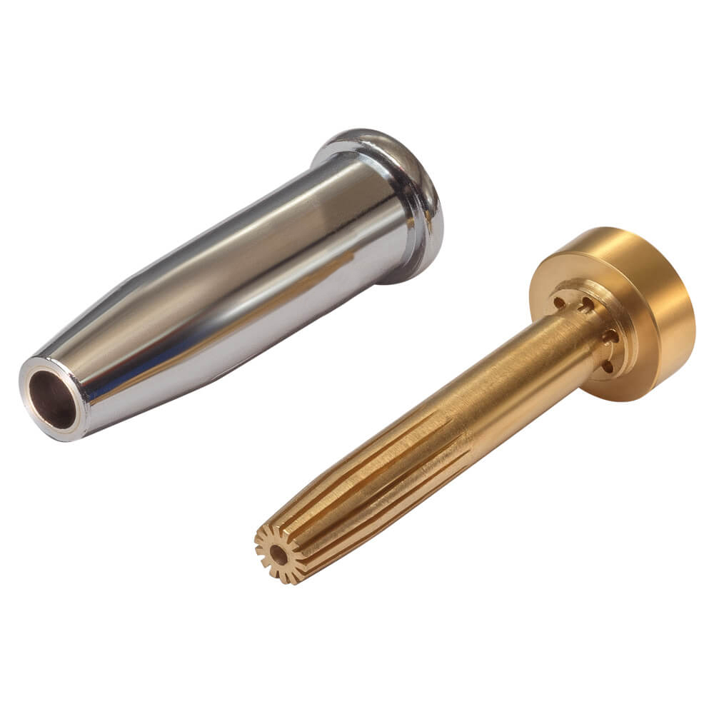 Неразборный ацетиленовый мундштук №3А к 3-х трубным резакам внутрисоплового смешения газов Р3-300 и Р3-345. Толщина разрезаемого металла 30–50 мм. Газосмесительный мундштук имеет три запорных пояска, которые предотвращают перетечку газов и обеспечивают смешение газов непосредственно в мундштуке, обеспечивая безопасное использование.