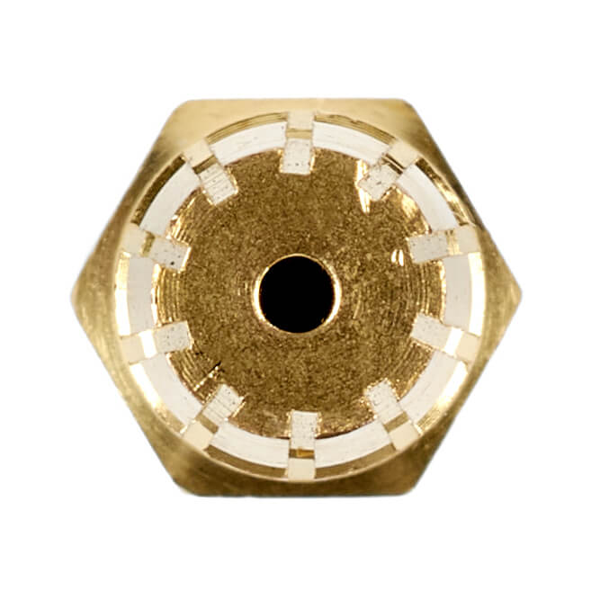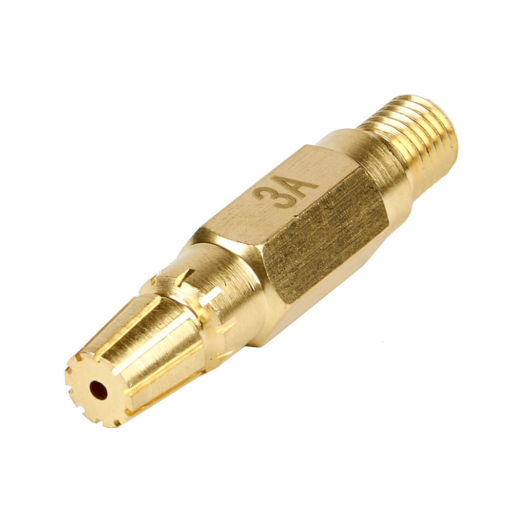 Латунный внутренний мундштук №3А для инжекторных ацетиленовых резаков Р2А-02М. Толщина разрезаемого металла 30–50 мм. Мундштук с шлицевыми пазами для выхода подогревающего пламени.