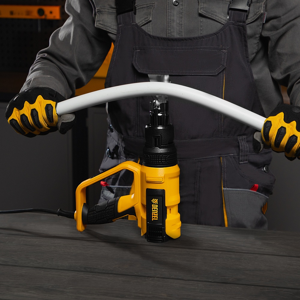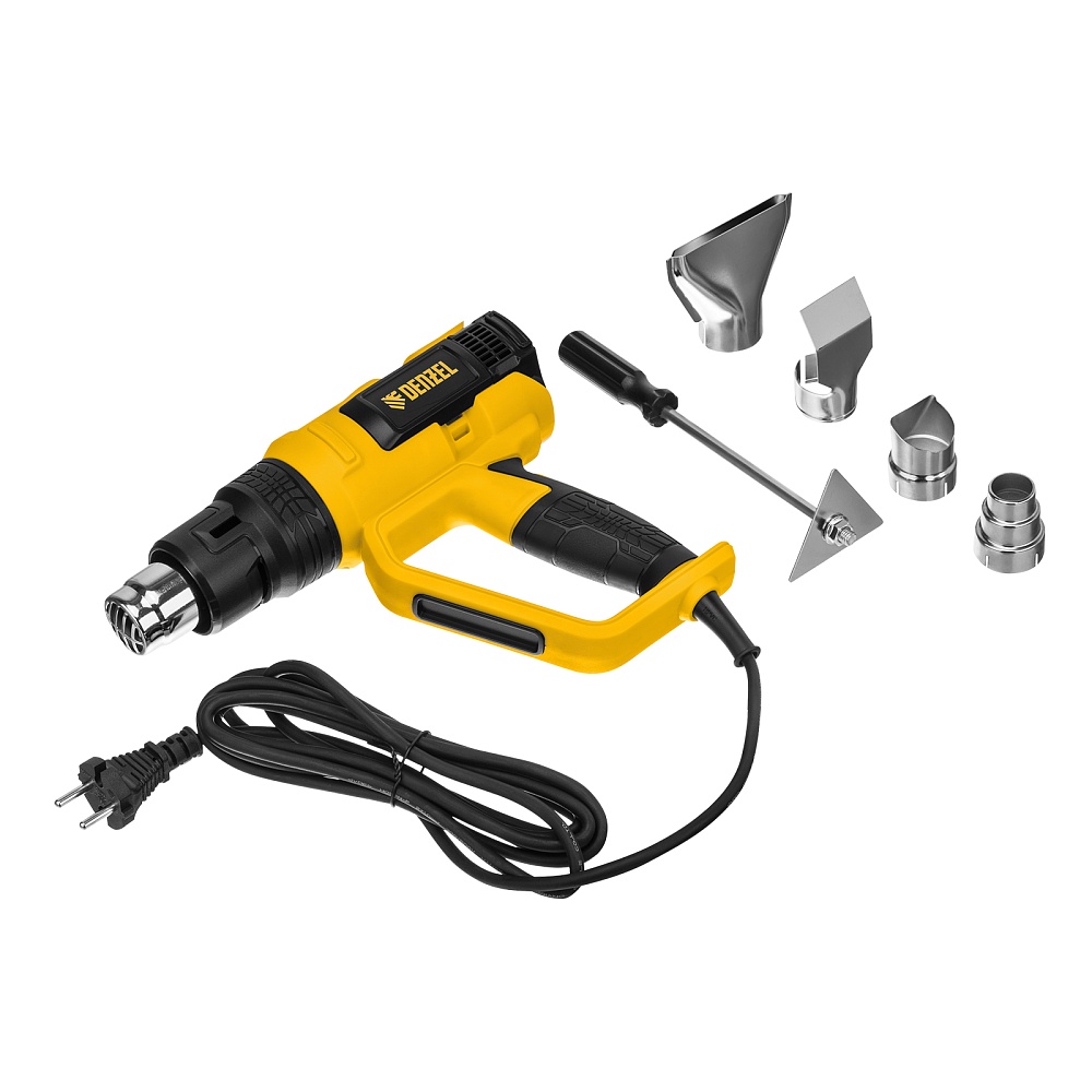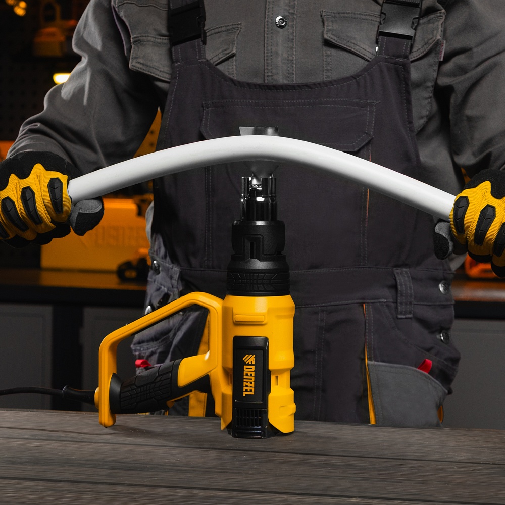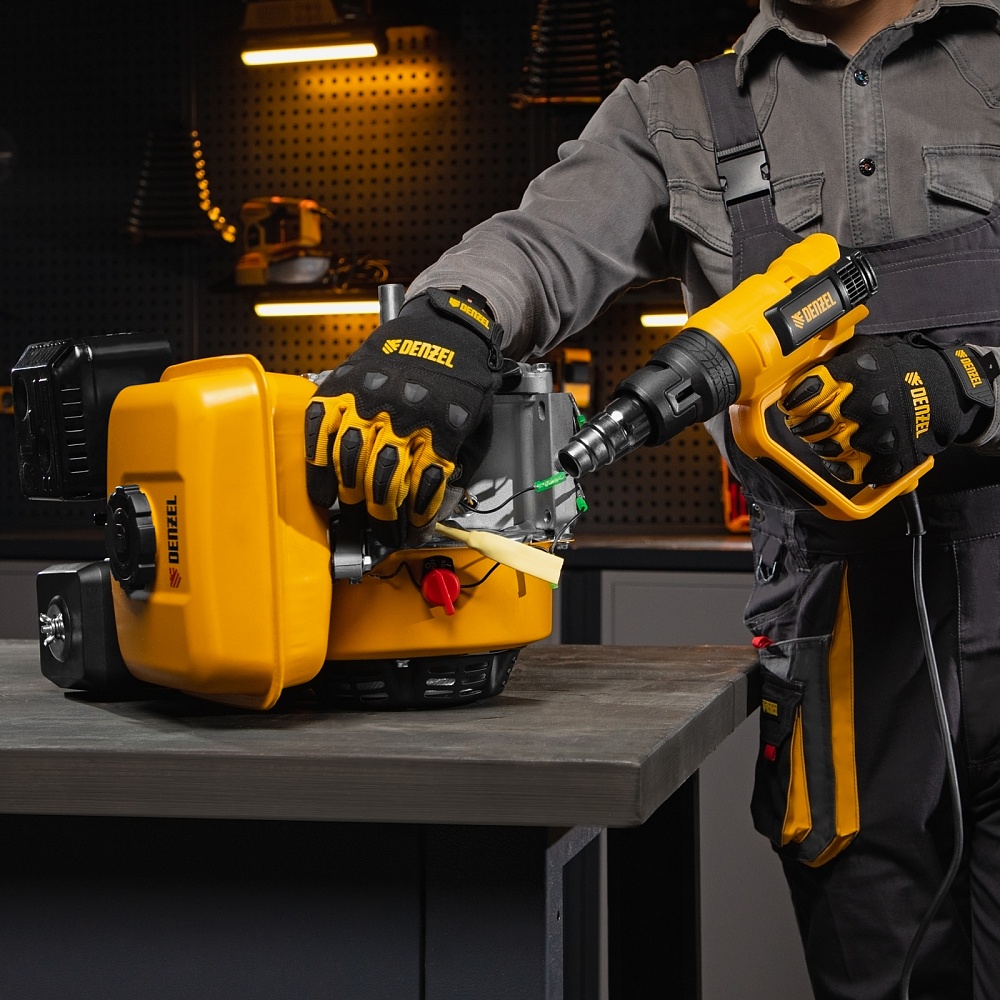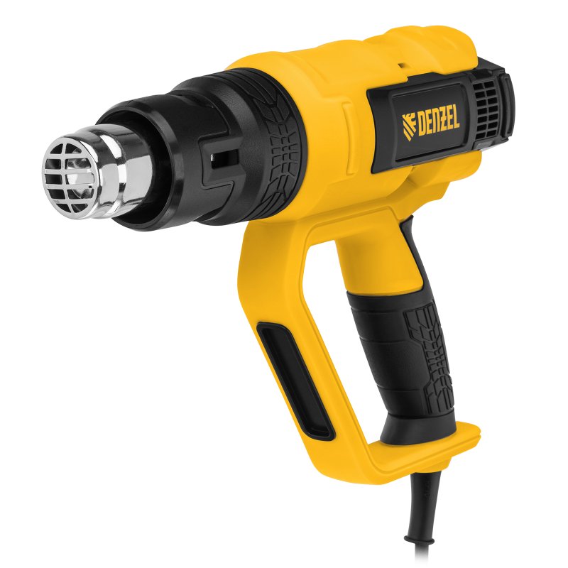 <p>Фен технический Denzel HG-2000M 28005 мощностью 2000 Вт, с 3 режимами работы, подходит для снятия лака и краски с различных поверхностей, размораживания и пайки труб, создания изгиба в пластиковых деталях, генерации точечного теплового потока для нагрева небольших участков и др. Справиться с этими задачами помогает треугольный скребок и 4 насадки: плоская, полукруглая, отражающая и редукционная.,Мощность фена 2 кВт обеспечивает стабильную производительность на уровне 250/500 л/мин, в зависимости от выбранного режима. Температура выходящего потока составляет 50/50-450/50-600 ℃.</p><h2>Преимущества</h2><ul><li>3 режима работы — низкая производительность с выбором температуры, высокая производительность с выбором температуры и режим продувки, позволяющий охладить фен и исключить тепловой удар после отключения.</li><li>Многозадачность — плавная аналоговая настройка температуры обеспечивает выполнение целого спектра задач — от деликатного просушивания до сварки и пайки.</li><li>Двухуровневая защита — фен отключается при риске перегрева или перегрузки, это позволяет избежать поломок и сохранить рабочий ресурс инструмента.</li><li>Качественная сборка — переключатель режимов безупречно справляется со своими задачами даже спустя длительное время.</li><li>Продуманная конструкция — фен можно зафиксировать в вертикальном положении соплом вверх, это помогает избежать отключения при перерыве в работе.</li><li>Безопасный захват — D-образная рукоятка исключает случайное соприкосновение с разогретой поверхностью.</li><li>Кабель питания длиной 3 м с резиновой изоляцией — можно расширить рабочую зону без помощи удлинителя, работать при температуре от 0 ℃ и без риска поломки подвергать фен кратковременному воздействию высоких температур.</li><li>Небольшой вес 940 г — инструментом удобно работать даже длительное время.</li><li>Гарантия 3 года — высокое качество фена подтверждено производителем.</li></ul>