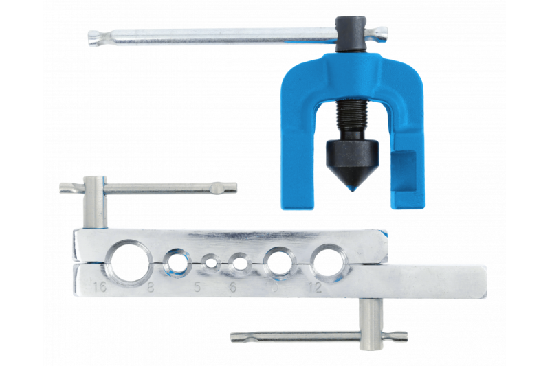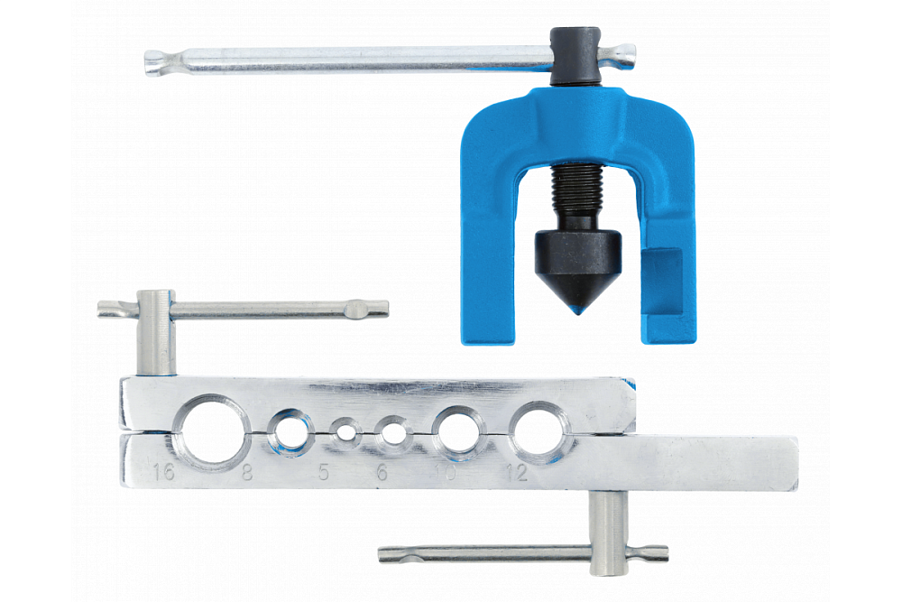 Набор для развальцовки труб из стали, цветных металлов, алюминия и пластмасс. Для изготовления конических соединительных фланцев под углом 90°. Предназначен для проведения монтажных, автомобильных и строительных работ.