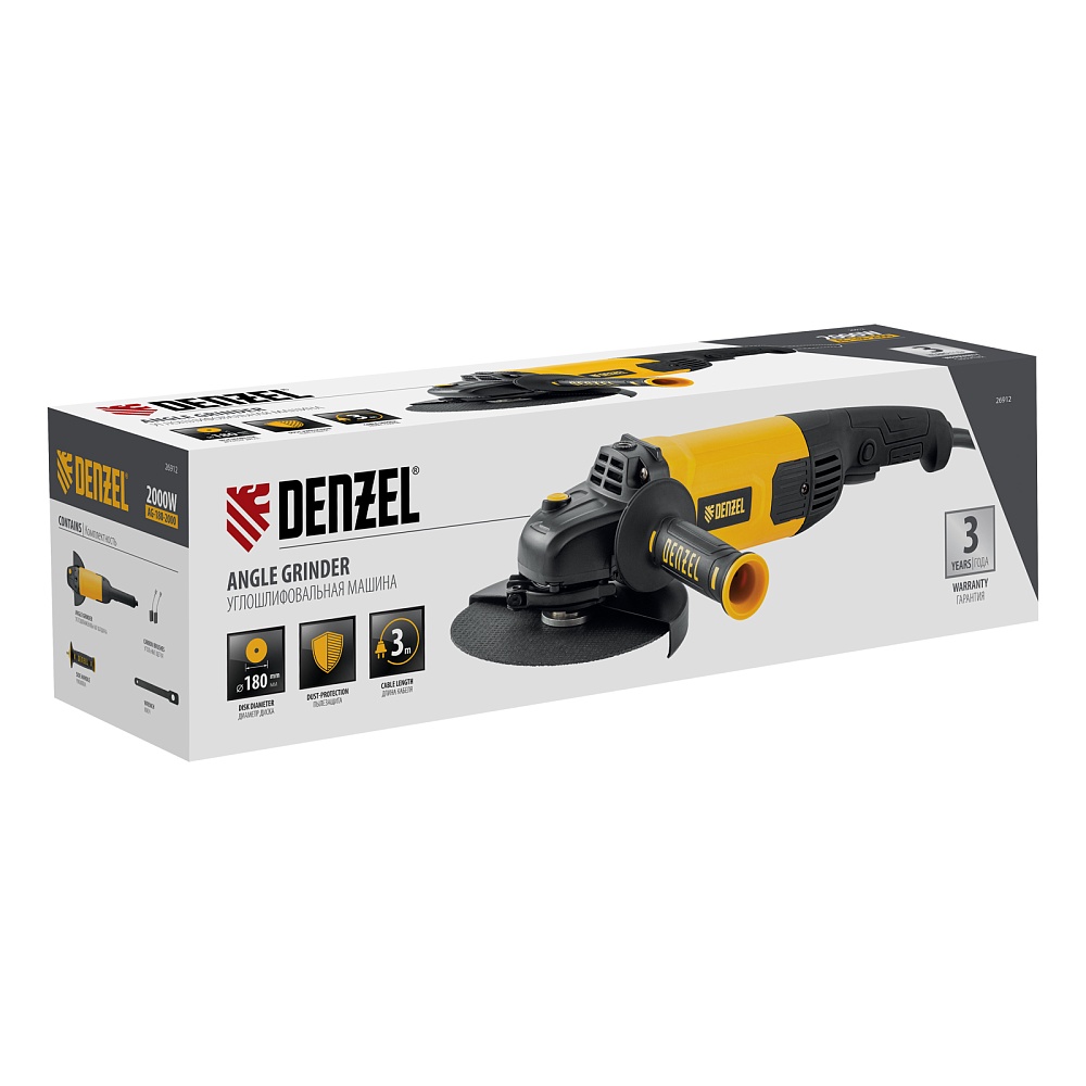 <p>Угловая шлифовальная машина Denzel AG180-2000 26912 мощностью 2000 Вт совместима с насадками максимальным диаметром 180 мм, поддерживает частоту вращения шпинделя 8500 об/мин, благодаря чему эффективно справляется с обработкой и зачисткой поверхностей, а также резкой, шлифовкой металла толщиной до 60 мм и камня. Пригодится дома, в гараже и на даче.</p><h2>Преимущества</h2><ul><li>Высокий ресурс — усиленная пылезащита обеспечивает 450 часов работы даже при резке камня или бетона.</li><li>Безопасность — кнопка блокировки предотвращает случайный запуск УШМ.</li><li>Надежность — усовершенствованная конструкция щеточного узла обеспечивает стабильную работу двигателя.</li><li>Быстрая подготовка к работе — для установки защитного кожуха на УШМ не требуются дополнительные инструменты.</li><li>Удобное обслуживание — в комплект входят специальный ключ и запасные угольные щетки.</li><li>Мобильность — кабель длиной 3 м позволяет увеличить рабочую зону.</li><li>Эргономичность — боковую рукоятку можно установить в 1 из 3 положений: слева, справа или сверху.</li><li>Комфортная работа — прорезиненная рукоятка удобно лежит в руке и не выскальзывает из ладони.</li><li>Гарантия 3 года — качество шлифовальной машинки подтверждено производителем.</li></ul>