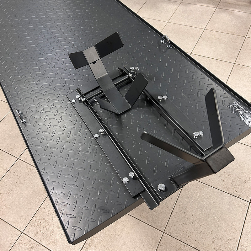 Подъемник оснащен механическим перекидным зажимом, имеющим достаточно широкий диапазон по размеру зажимаемых колес и возможность увеличения длины платформы на 200 мм благодаря выдвижной конструкции зажима. На платформе есть дуги, позволяющие закрепить мототехнику стяжными ремнями к самой платформе.