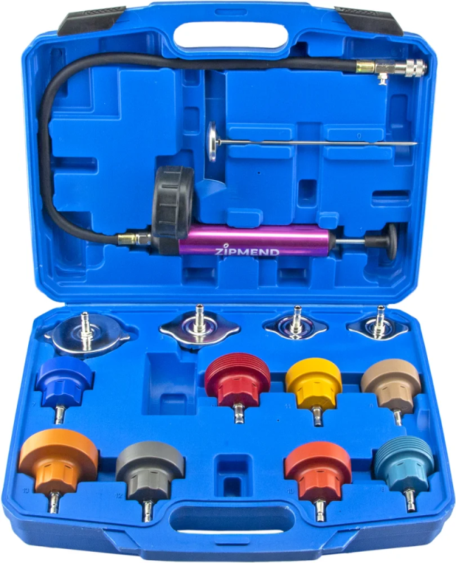 - Набор для проверки герметичности системы охлаждения, состоит из 14 предметов.