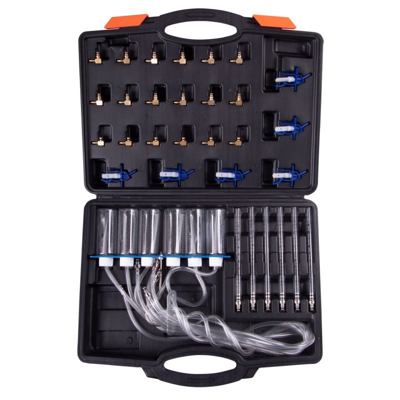 Предназначен для тестировании дизельных форсунок двигателей с системой впрыска Сommon Rail по обратному сливу топлива без снятия форсунок с двигателя. При помощи набора можно измерить количество топлива, которое каждая форсунка возвращает в топливный бак.