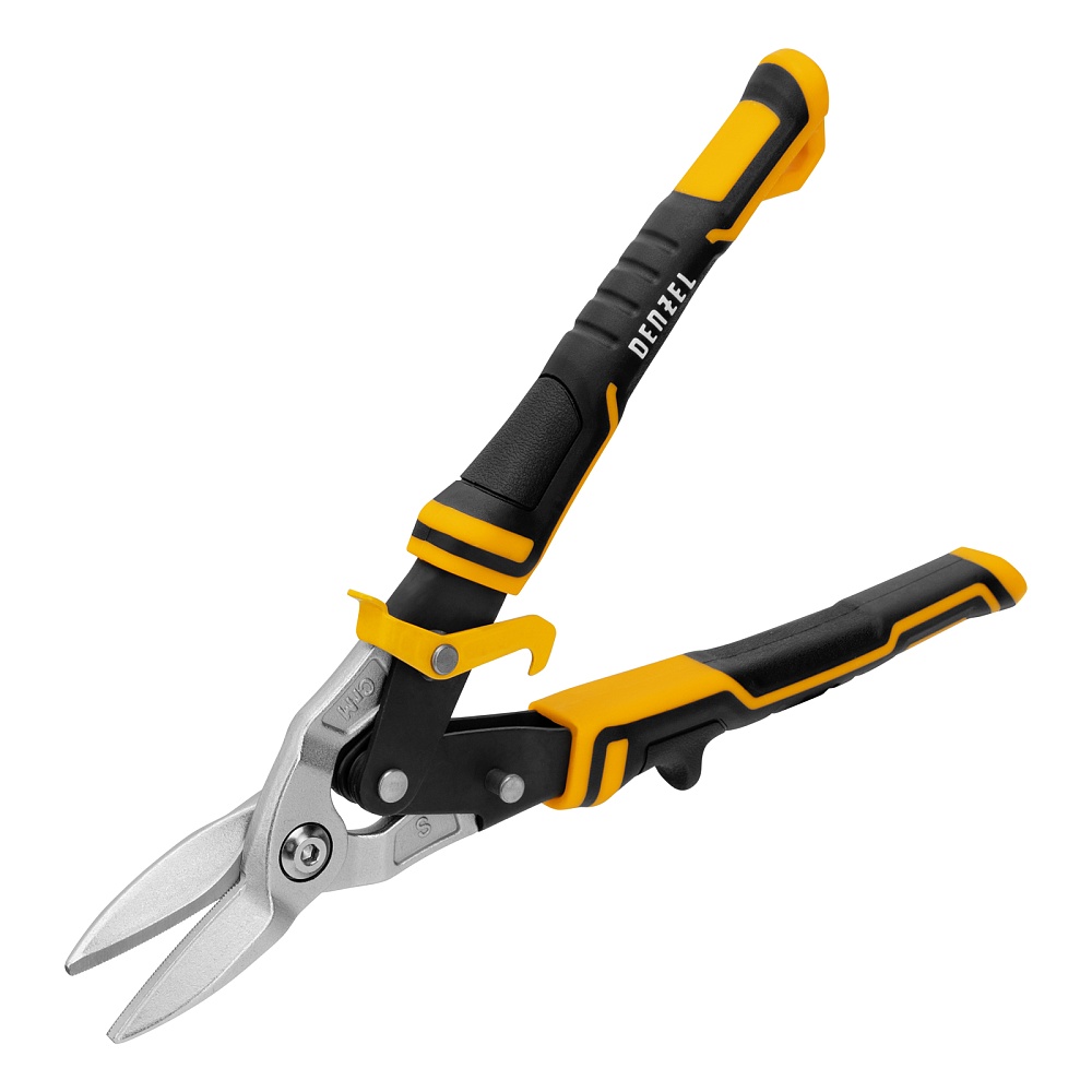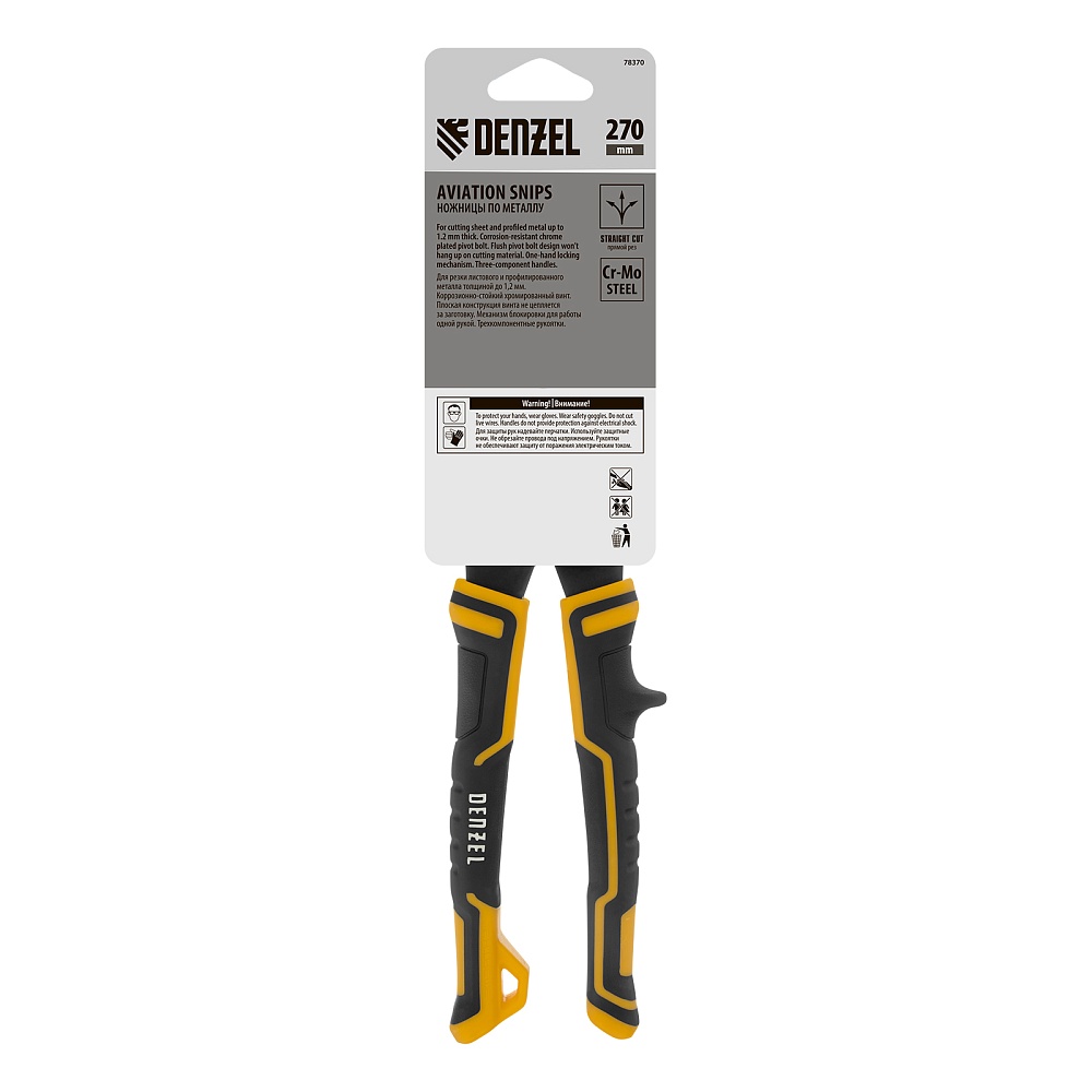 <p>Ножницы по металлу Denzel 78370 общей длиной 270 мм, из стали-CrMo, с трехкомпонентными рукоятками, предназначены для прямого реза листовых металлических заготовок и металлопрофиля толщиной до 1,2 мм. Инструмент с усиленной конструкцией осевого шарнира рассчитан на профессиональное использование. Ножницы используются для проведения строительных, кровельных и слесарных работ.</p><h2>Преимущества</h2><ul><li>Высокое качество исполнения — ножницы изготовлены из прочной хромомолибденовой стали методом горячей штамповки, остро заточенные кованые лезвия с насечками не соскальзывают с заготовок.</li><li>Эффективность — режущие кромки закалены до твердости 60-62 HRC и легко справляются даже с прочной «нержавейкой».</li><li>Безопасность — блокировочный замок предотвращает случайное раскрытие лезвий во время транспортировки и хранения.</li><li>Комфортная работа — плоский соединительный винт не цепляется за заготовки, удлиненные трехкомпонентные рукоятки не выскальзывают из руки.</li><li>Удобное хранение — на рукоятке имеется проушина для подвешивания на крючок или гвоздь.</li></ul>
