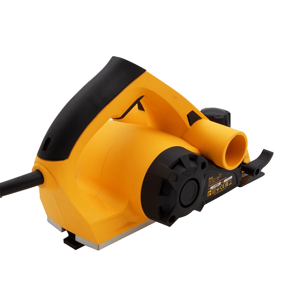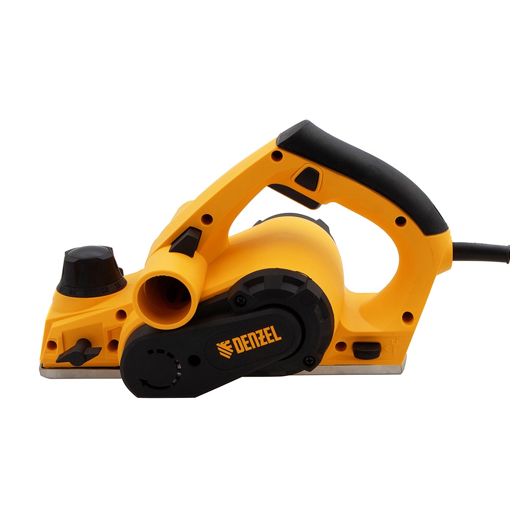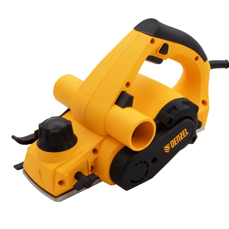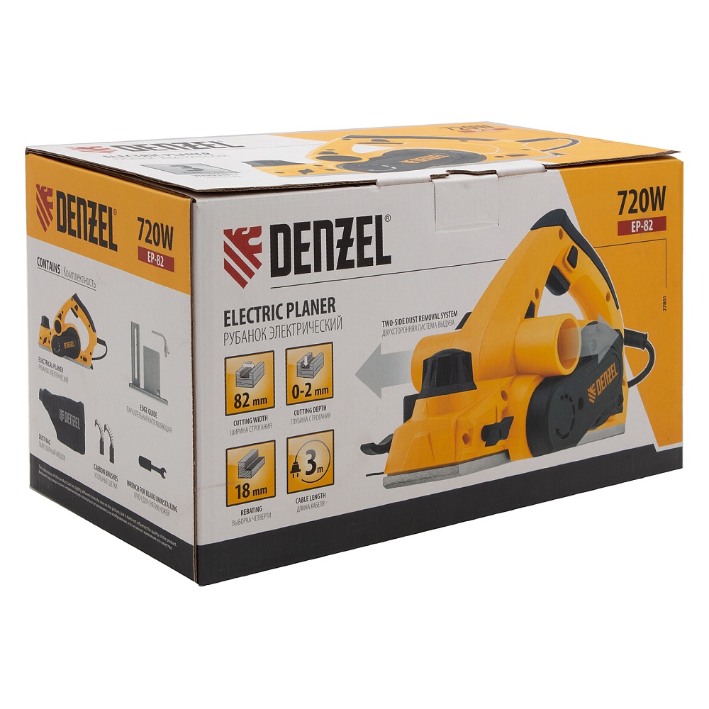 <p>Электрический рубанок Denzel EP-82 27801 мощностью 720 Вт обеспечивает ширину обработки 82 мм и предназначен для строгания плоских деревянных поверхностей, снятия фасок, выборки четверти. Частота вращения барабана составляет 16000 об/мин, выборка четверти производится на глубину до 18 мм, что позволяет эффективно решать поставленные задачи. Инструмент подходит для бытового использования.</p><h2>Преимущества</h2><ul><li>Удобная настройка — предусмотрено 11 позиций глубины строгания в диапазоне 0-2 мм.</li><li>Двухсторонняя система выброса стружки — рабочее место остается чистым, возможность переключения направления предотвращает засорение канала выброса и снижает частоту его очистки.</li><li>Безопасность пользователя — блокировка выключателя предотвращает случайный запуск двигателя.</li><li>Защита рабочей поверхности — предохранительный подпятник исключает повреждение обрабатываемого материала и ножей во время перерывов в работе.</li><li>Надежность — опорные подошвы из алюминиевого сплава не подвержены деформации.</li><li>Эффективность — режущий барабан электрорубанка оснащен двумя двусторонними ножами, которые обеспечивают идеальный срез.</li><li>Кабель питания длиной 3 м — удобно перемещаться по рабочему пространству.</li><li>Полная готовность к работе — в комплект поставки входит пылесборник, параллельная направляющая, запасные угольные щетки и ключ для крепления ножей.</li><li>Продуманная конструкция — для хранения ключа предусмотрен специальный отсек.</li><li>Комфортная работа — направление выброса стружки переключается одним рычагом, параллельная направляющая и ограничитель глубины выборки четверти помогают точно вести рубанок.</li><li>Эргономичность — рукоятка с резиновым покрытием удобно ложится в руку.</li><li>Гарантия 3 года — высокое качество инструмента подтверждено производителем.</li></ul>