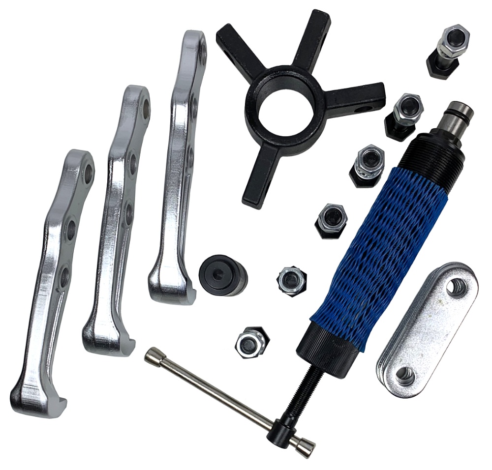 - Набор состоит из трех захватов, шести соединительных пластин, гидроцилиндра, основания для захватов, носового адаптера для цилиндра, гаек и болтов.