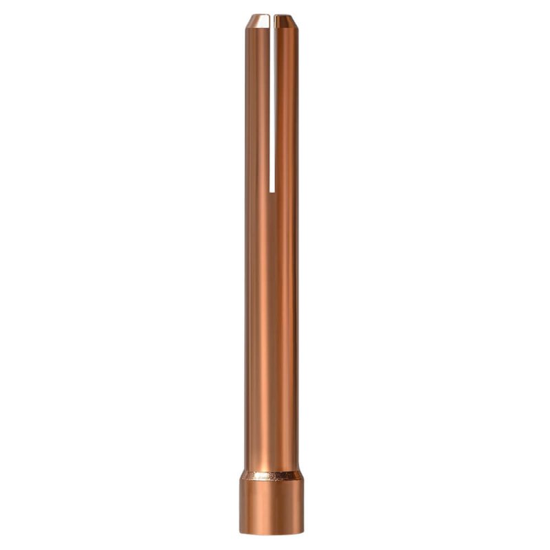 Цанга выполнена из меди и вставляется в держатель цанги. Служит для плотной фиксации вольфрамового электрода в горелке TIG. Диаметр цанги должен совпадать с диаметром вольфрамового электрода, а также с диаметром держателя цанги. Совместима с горелками TIG серии TP 17/18/26.