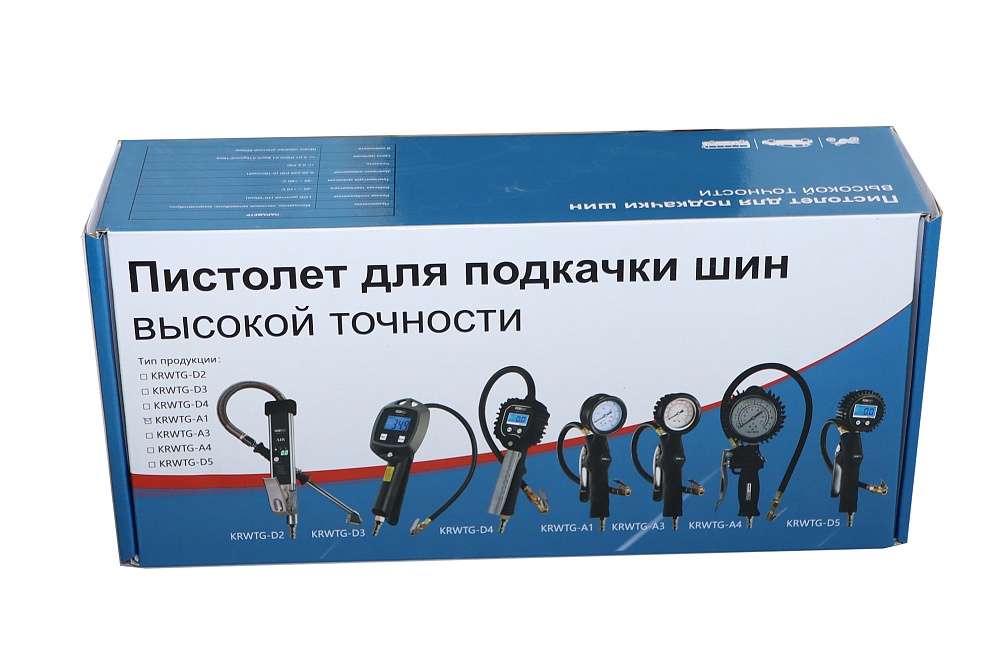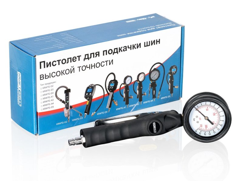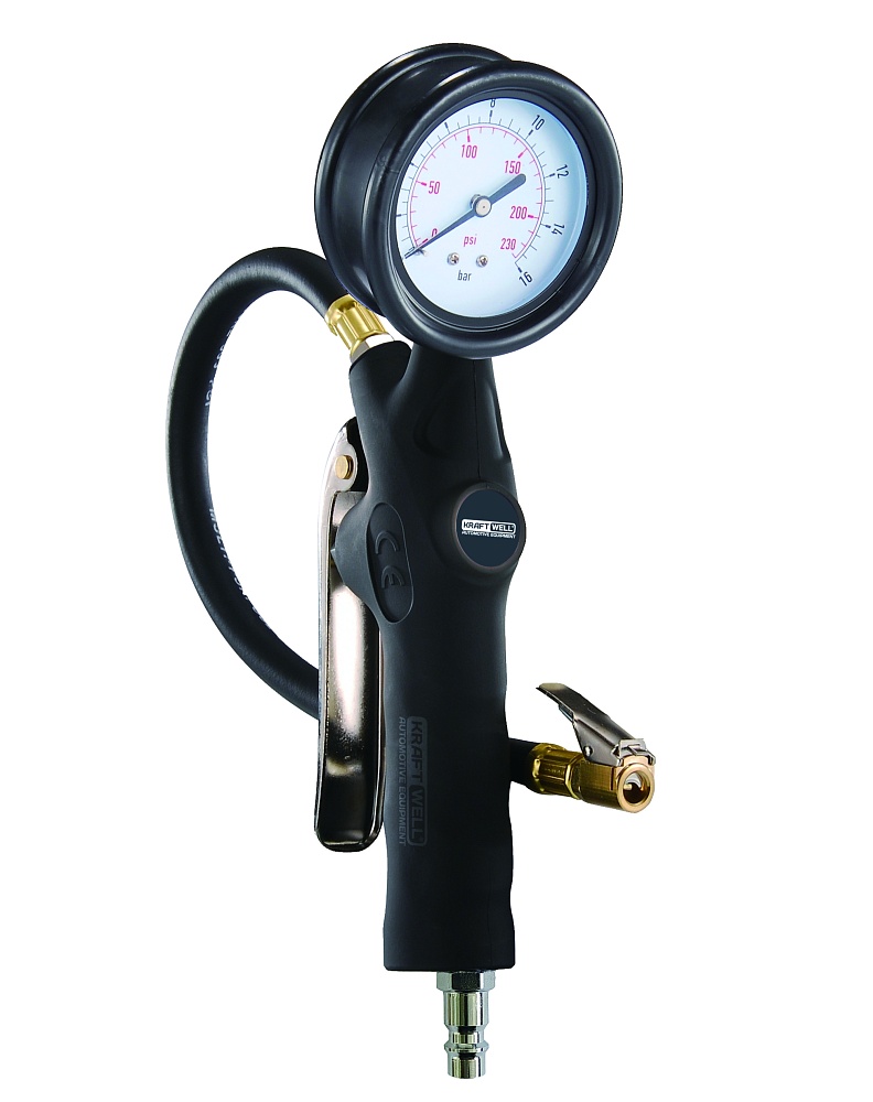 KRWTG-A2 KraftWell Пистолет для подкачки шин. В цветной коробке. Аналоговый жидкостный манометр. Пластиковая рукоятка, пластиковый курок. Давление до 16 бар.