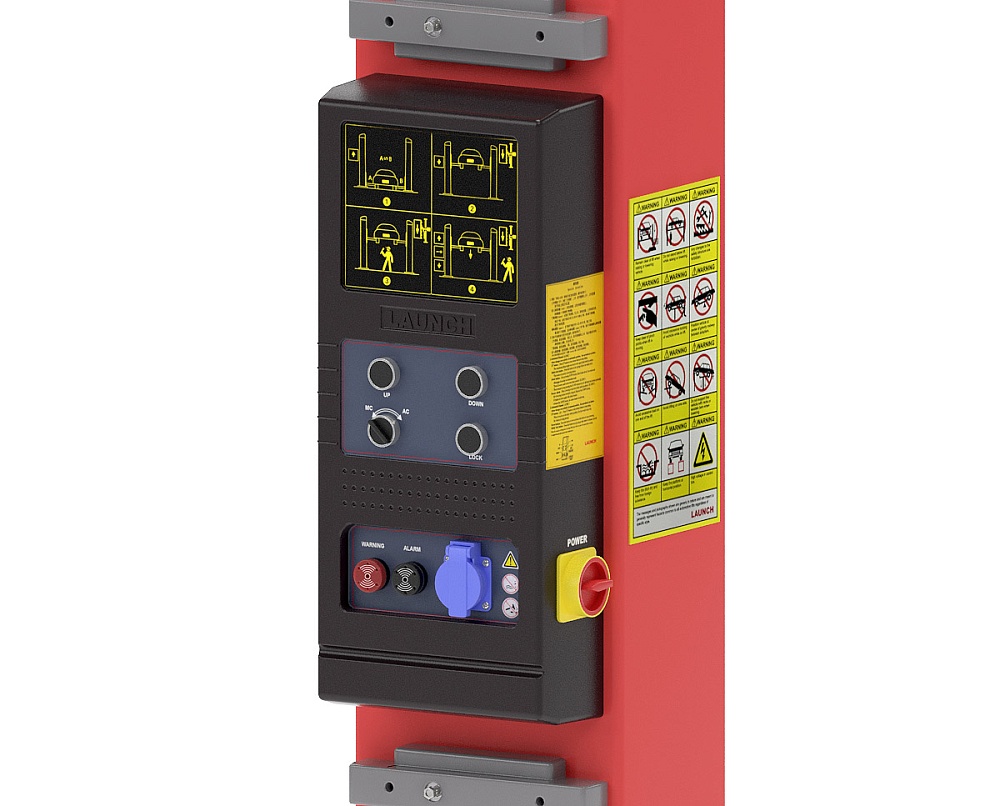 Двухстоечные подъемники Launch в модификациях SBA имеют удобный пульт управления, оборудованный розеткой 220В (класс защиты IP54). Имеет два режима работы (ручной и автома-тический) и аварийную индикацию. Автоматизированная система управления стопорами позволяет работать с подъемником простым нажатием кнопок Вверх / Вниз, без необходимости ручной дезактивации стопоров: система самостоятельно активирует/деактивирует стопорные механизмы и отслеживает работу крайних положений подъемника по концевикам.