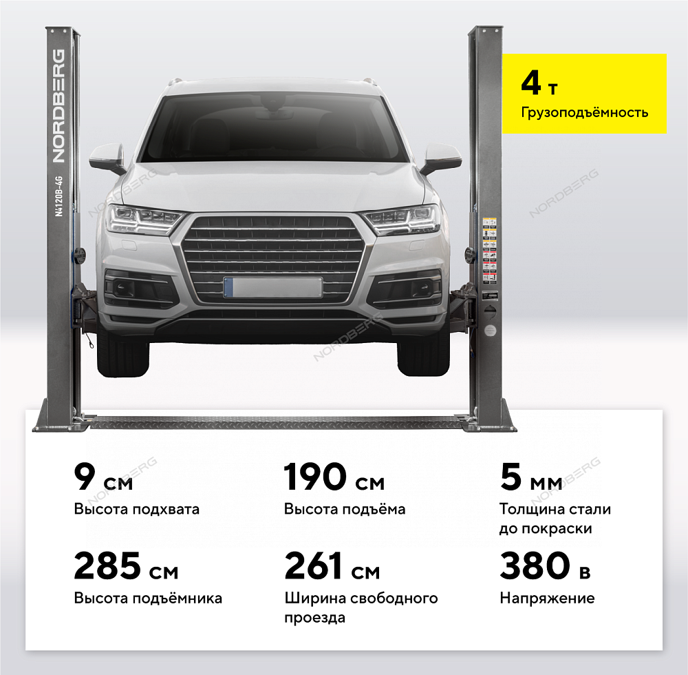 Двухстоечный подъемник NORDBERG N4120B-4G_3+2_380 – безопасное и надежное оборудование для проведения различных видов работ по обслуживанию и ремонту автотранспорта в автосервисах и СТО.