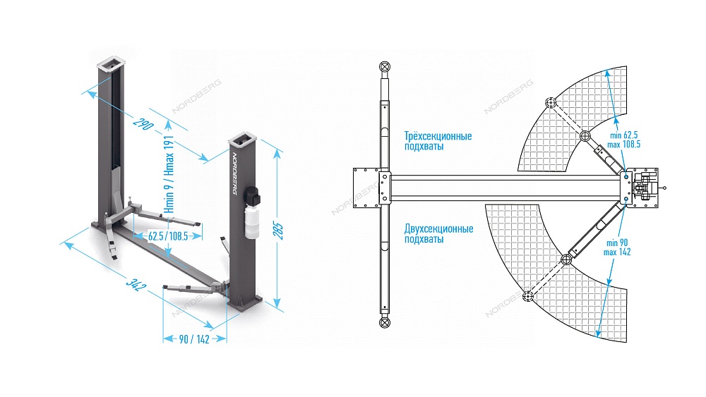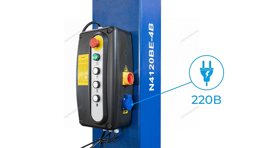 Подъемник двухстоечный 4 т, с электростопорами, 380 В, синий NORDBERG N4120BE-4B_3+2_380