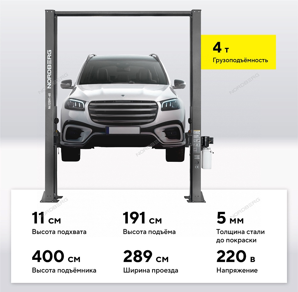Подъемник двухстоечный 4 т, верхняя синхронизация, H=4 м, 380 В, серый NORDBERG N4120H1-4G_3+2_380 купить в Уфе цена ✅ - Все для СТО