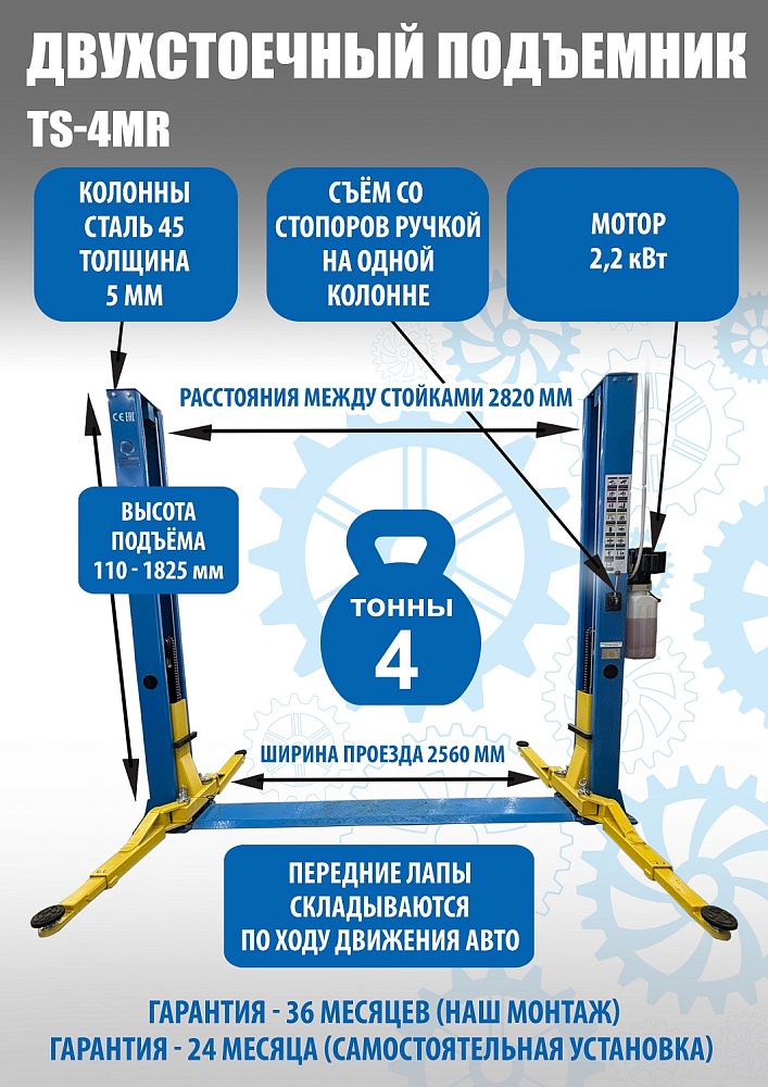 TS-4MR Подъемник 2-хст. г/п 4 т съем-ручка+проставки (2025) (220 V ТВ)