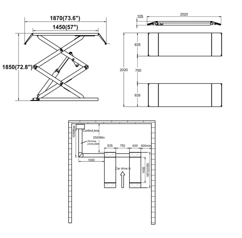 Ножничный заглубляемый подъемник, грузоподъемность 4.0 т., высота подъема 2230 мм., двойные ножницы короткая платформа 1654-2054 мм.