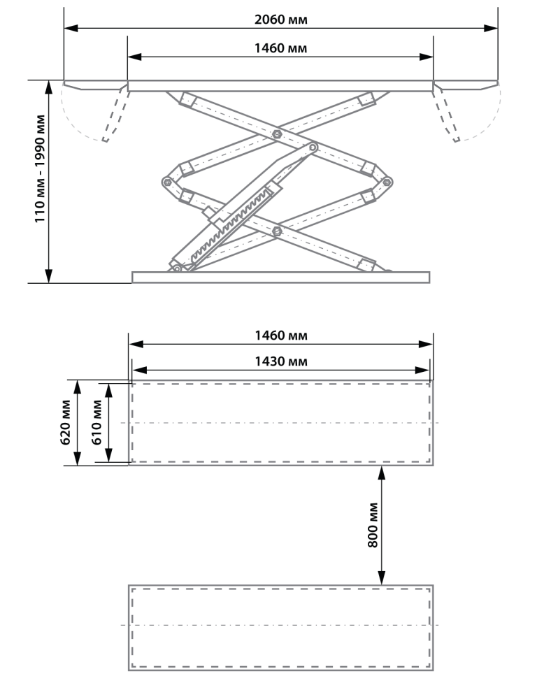 Высота подъема 2130 мм, от уровня пола 1800 мм., заглубление 330 мм.