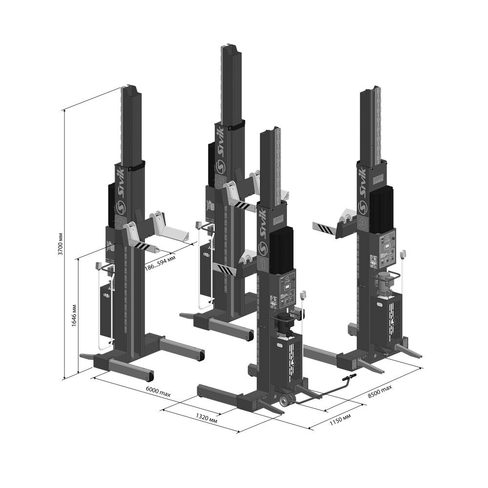 • Подъемник из 4 колонн с помощью комплекта дополнительных стоек можно нарастить до 6 колонн