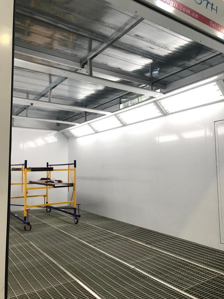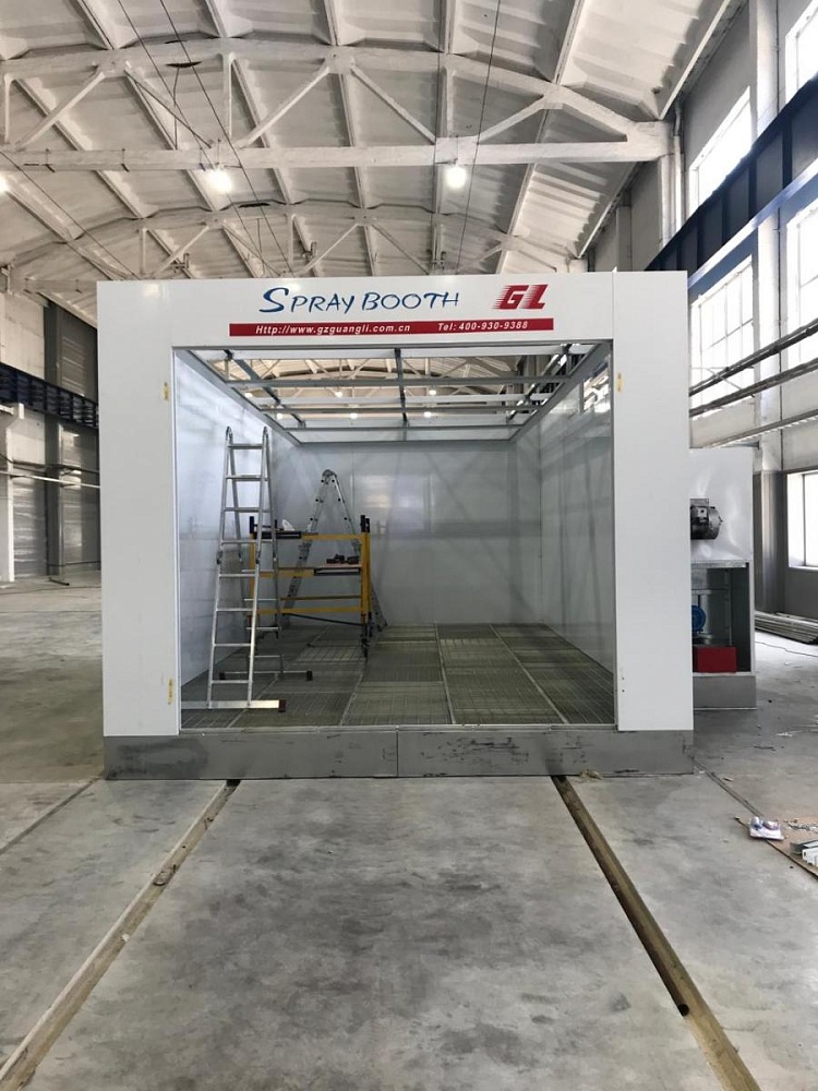 Окрасочно-сушильная камера Guangli GL2 имеет в своей основе металлическое основание высотой 25 см, напольные решётки выдерживает нагрузку до 600 кг на одно колесо. В стандартном исполнении камера Guangli GL2 комплектуется дизельной горелкой из нержавеющей стали Riello 40 G20 итальянского производства, мощность горелки составляет 185 кВт. Корпус Guangli GL2 собирается из сэндвич-панелей толщиной 50 мм, в качестве наполнителя используется пенополистирол, опционально можно в качестве наполнителя использовать минеральную вату. Фронтальная дверь окрасочно-сушильной камеры состоит из 3-х створок, аварийная дверь находится сбоку камеры, она оборудована пневматическим затвором. Окрасочно-сушильная камера Guangli GL2 оборудована двумя вентиляторами: приточным и вытяжным (особенность комплектации). Наличие двух вентиляторов позволяет увеличить воздухообмен внутри камеры до 24 000 м³/час. Приточный вентилятор обладает мощностью 5.5 кВт, мощность вытяжного вентилятора составляет 4 кВт. Заслонка, переключающая режимы окраска/сушка, срабатывает автоматически посредством пневматики. Система фильтров состоит из: потолочного фильтра (степень фильтрации 98%), напольного фильтра (степень фильтрации 95%) и фильтра предварительной очистки (степень фильтрации 80%). Потолочный фильтр окрасочно-сушильной камеры состоит из 4-х фильтров, которые монтируются над несущей рамой, выполненной из стали и покрашенной порошковым покрытием. Напольный фильтр состоит из 2-х частей и одного выпускного фильтра. Верхнее освещение состоит из 10 плафонов, каждый плафон состоит из 4 ламп по 40 Вт. Блок управления и его компоненты произведены в Китае, они защищены от перегрузки, перегрева и пропадания фазы, мотор с линейным приводом. При истечении заданных значений времени, работа камеры автоматически прекращается. Покраска происходит при постоянной температуре. Питание камеры осуществляется посредством трёхфазной сети напряжением 380 В, мощность установки 9.5 кВт.