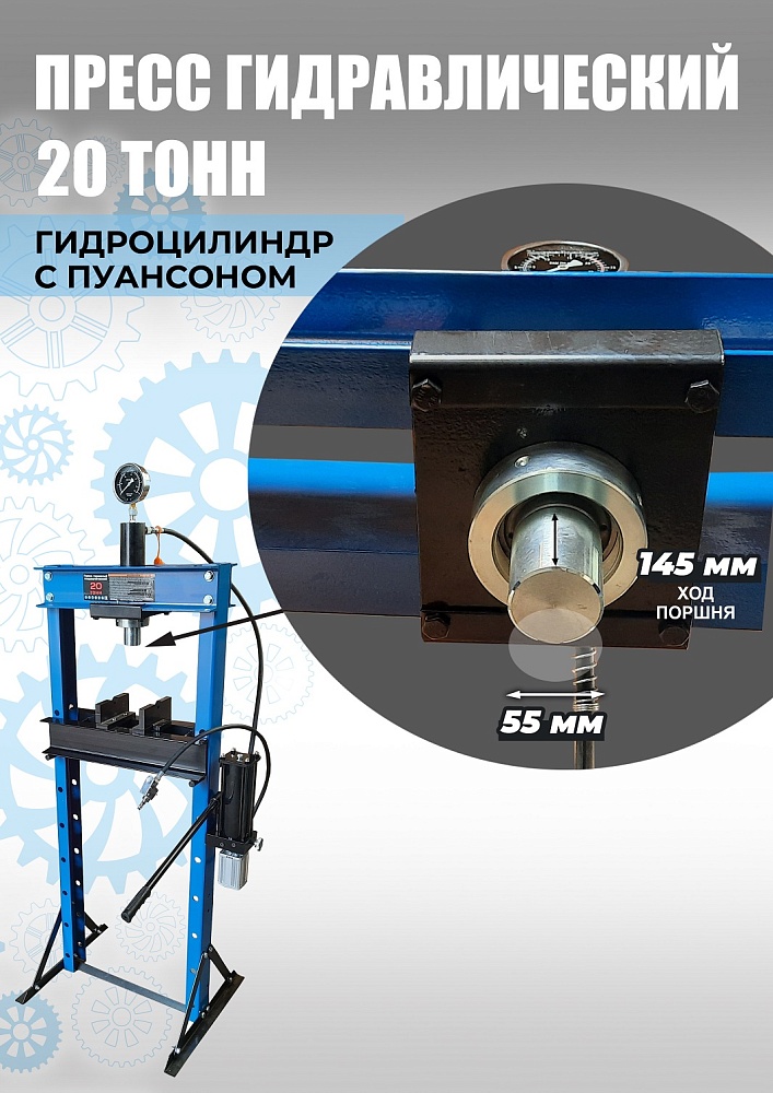 Пресс гидравлический 20 тонн, для автосервиса. Ход поршня 0-145 мм. Рабочее окно 500х1110 мм. Управление ручное/пневматическое, манометр, гидроцилиндр с пуансоном перемещается по всей ширине каретки. Рекомендуется для выпрессовки подшипников, деталей машин, втулок и т.п. в автосервисе, Гараже и СТО. Цвет синий. Доставка по РФ и ТС. Подъёмная площадка регулируется по высоте и фиксируется в требуемом положении.
