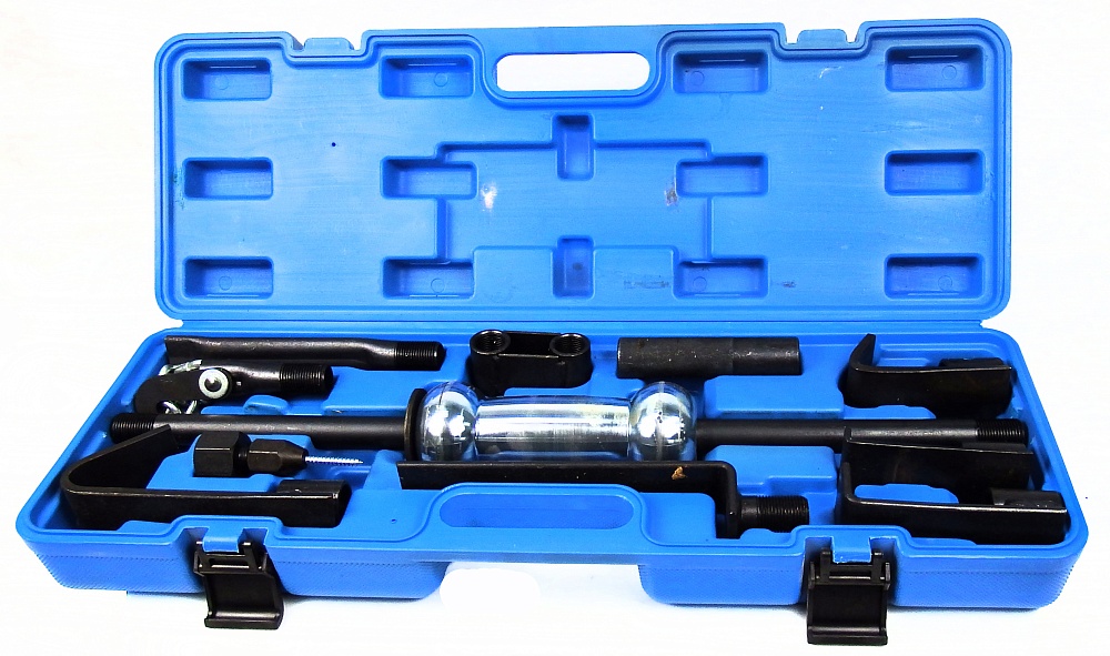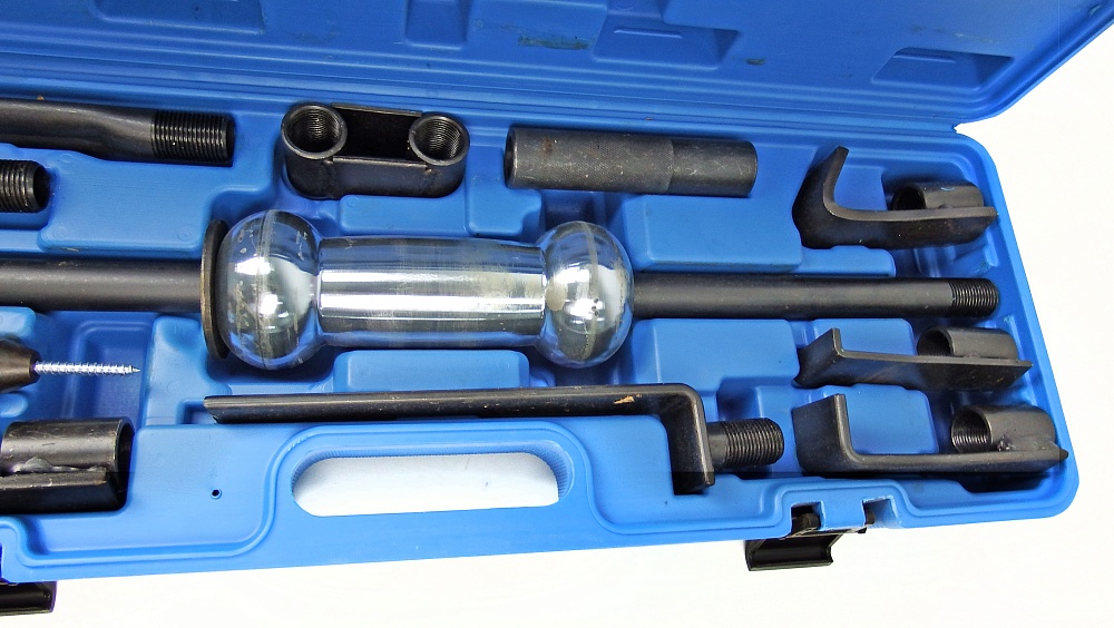 Обратный молоток TA-D1089 позволяет восстановить геометрию кузовных деталей автомобиля. С его помощью можно удалить вмятины, а также работать с деталями, расположенными в труднодоступных местах. Принцип работы заключается в том, чтобы прикрепить необходимый захват к деформированной детали и ударить в опорную шайбу обратным молотком. Для более удобного хранения набор поставляется в кейсе.