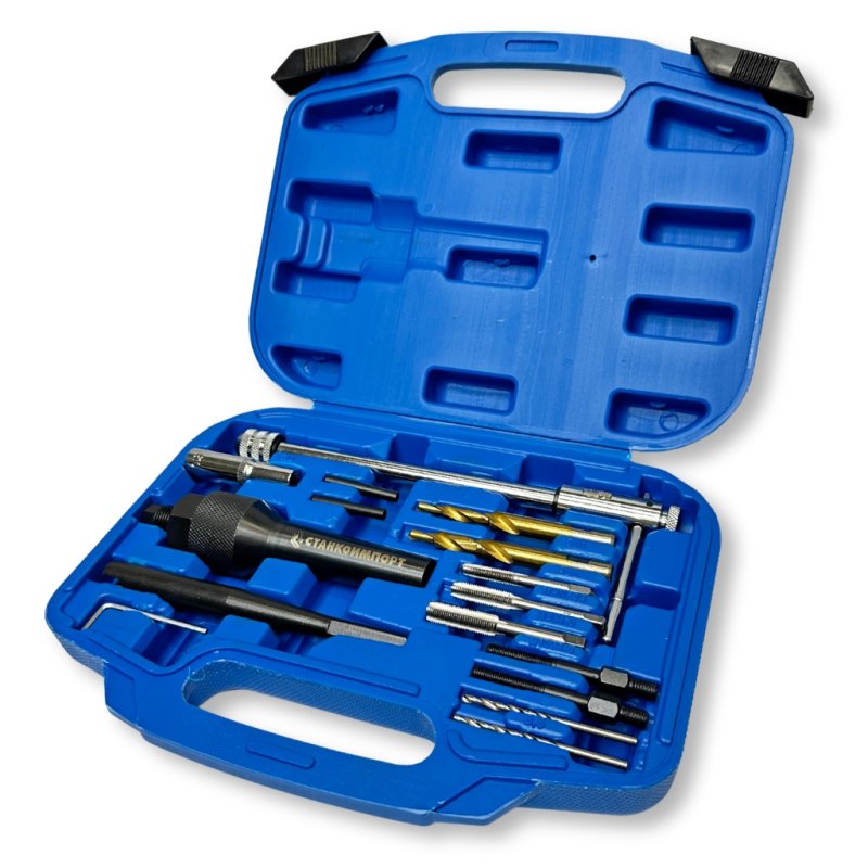 Набор приспособлений предназначен для извлечения сломанных свечей накаливания механическим путём без демонтажа головки блока цилиндров. Комплектация: 1. Метчики: 3шт 2. Держатель для сверла — 1 шт.; 3. Сверла: Ø3.5 — 2 шт.; 4. Торцевой ключ для откручивания свечи — 1 шт.; 5. Ступенчатые свёрла — 2 шт.; 6. Т-образный вороток — 1 шт.; 7. Вытяжное устройство для извлечения свечи — 1 шт.; 8. Ключ шестигранный — 1 шт.; 9. Шпилька для чистовой прогонки резьбы — 2 шт.; 10. Центровки для сверла — 2 шт.