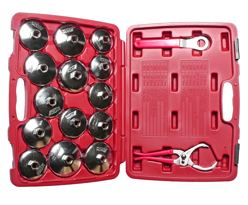 Съемник масляного фильтра "чашка" набор 16 шт. Применяется с инструментом под квадрат 1/2" или ключом 21 мм. Головки изготовлены из стали. В комплекте: