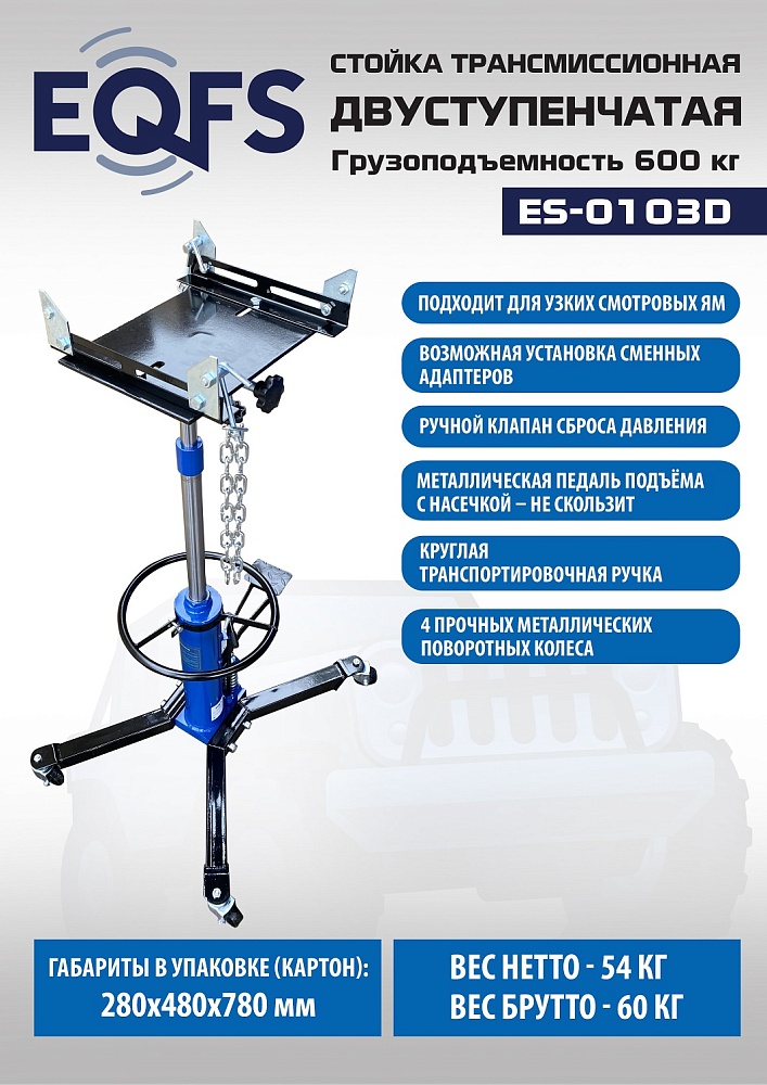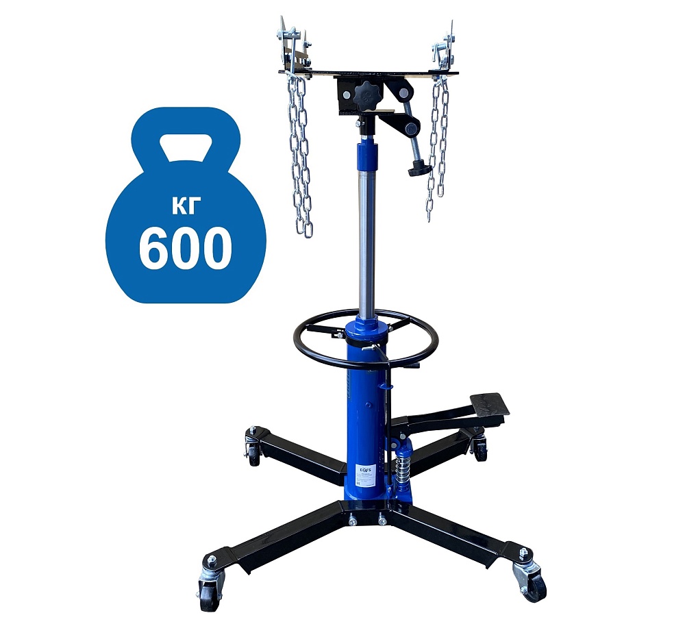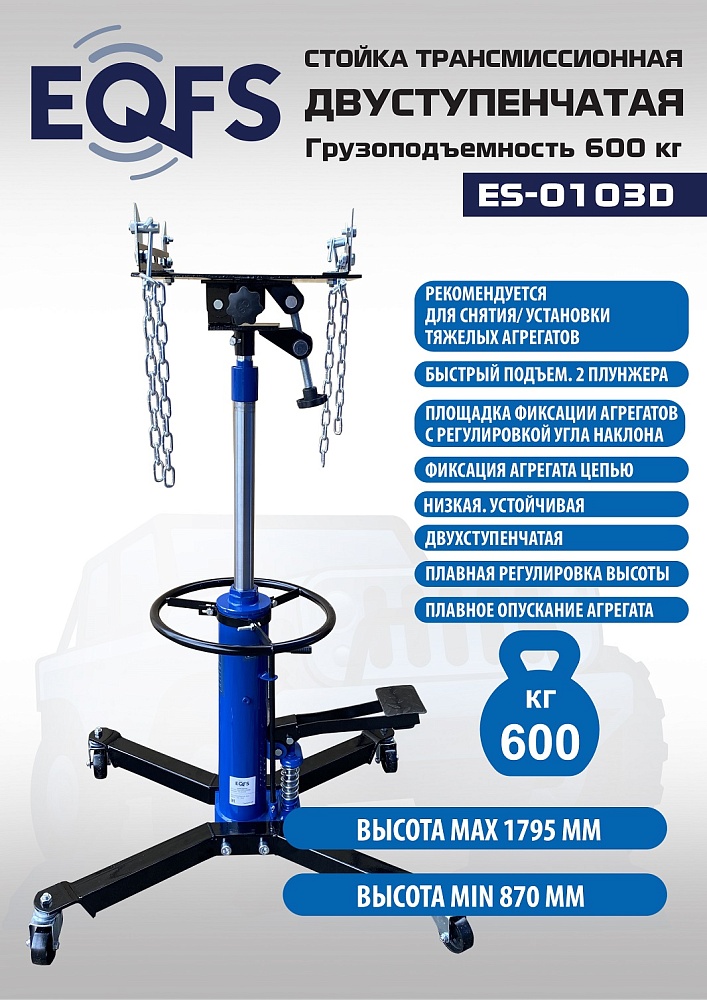 Профессиональная серия. Низкая. Высокопроизводительный двухплунжерный насос для быстрого подъема. Двухступенчатый хромированный шток. Удобная педаль накачки. Круглая ручка для перемещения. Для агрегатного участка – с площадкой, цепями и возможностью транспортировки агрегата. Подъём 870-1795мм. г/п 600кг.<br /><br /><p></p>Преимущества ES0103D стойка трансмиссионная 600 кг :<br />Регулируемая по углу наклона приемная площадка со страховочными цепями.<br />Двухступенчатый хромированный шток<br />Высокая точность изготовления узлов делает стойку практически "неубиваемой"<br />Низкая высота  в сложенном виде: 870 мм<br />Подходит для узких смотровых ям<br />4 прочных поворотных колеса выполнены из металла, а не из пластика, что значительно увеличивает срок эксплуатации.<br />Круглая металлическая ручка для удобства транспортировки по цеху.<br />Высокопроизводительный двухплунжерный насос для быстрого подъема<br />Удобная педаль накачки стойки выполнена с противоскользящей насечкой.<br />Возможность применения сменных адаптеров<br />Высокая чистота обработки внутренних поверхностей гидравлического цилиндра<br />Система сальников: О – образное кольцо + О – образное уплотнение из PU<br />Оборудована отверстием с заглушкой для заливки масла. гидравлическое масло. Емкость 1,5л.<br />
