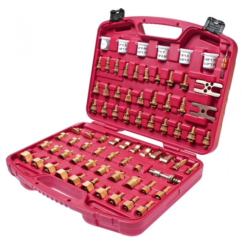 В набор входят различные адаптеры для тестирования системы кондиционирования на предмет утечек.