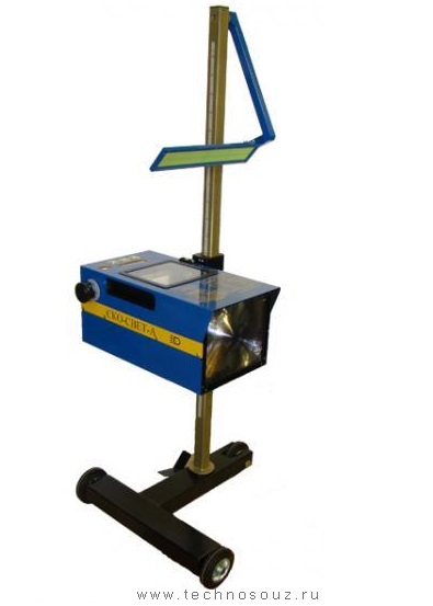 Прибор проверки и регулировки света фар оптико-механический, лазерный наводчик, электронный люксметр, зеркальный визир, регулируемый измерительный щит, основание на колесиках, неподвижная стойка со скользящими нейлоновыми колодками. Работает с галогеновыми, ксеноновыми и LED фарами