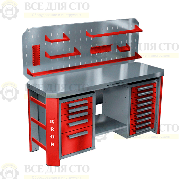 Повышенная прочность. Благодаря своей уникальной конструкции и толщине составных деталей, максимальная распределенная нагрузка на верстак может составлять до 6000 кг, а на ящики и полки 50 кг.