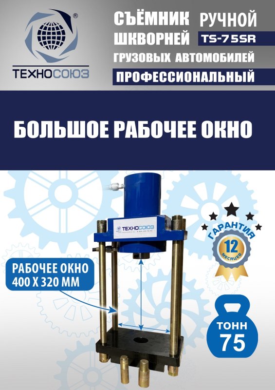 Компактный гидравлический съемник шкворней TS-75SR для грузовиков (MAN, Mercedes, Scania, Volvo, КамАЗ, корейские/китайские), тракторов, погрузчиков, спецтехники — усилие 75 тонн, ручной насос, ход поршня 160 мм, диаметр шкворня до 60 мм. Рабочее окно 400×320 мм, мобильный на колесах для выездных работ.